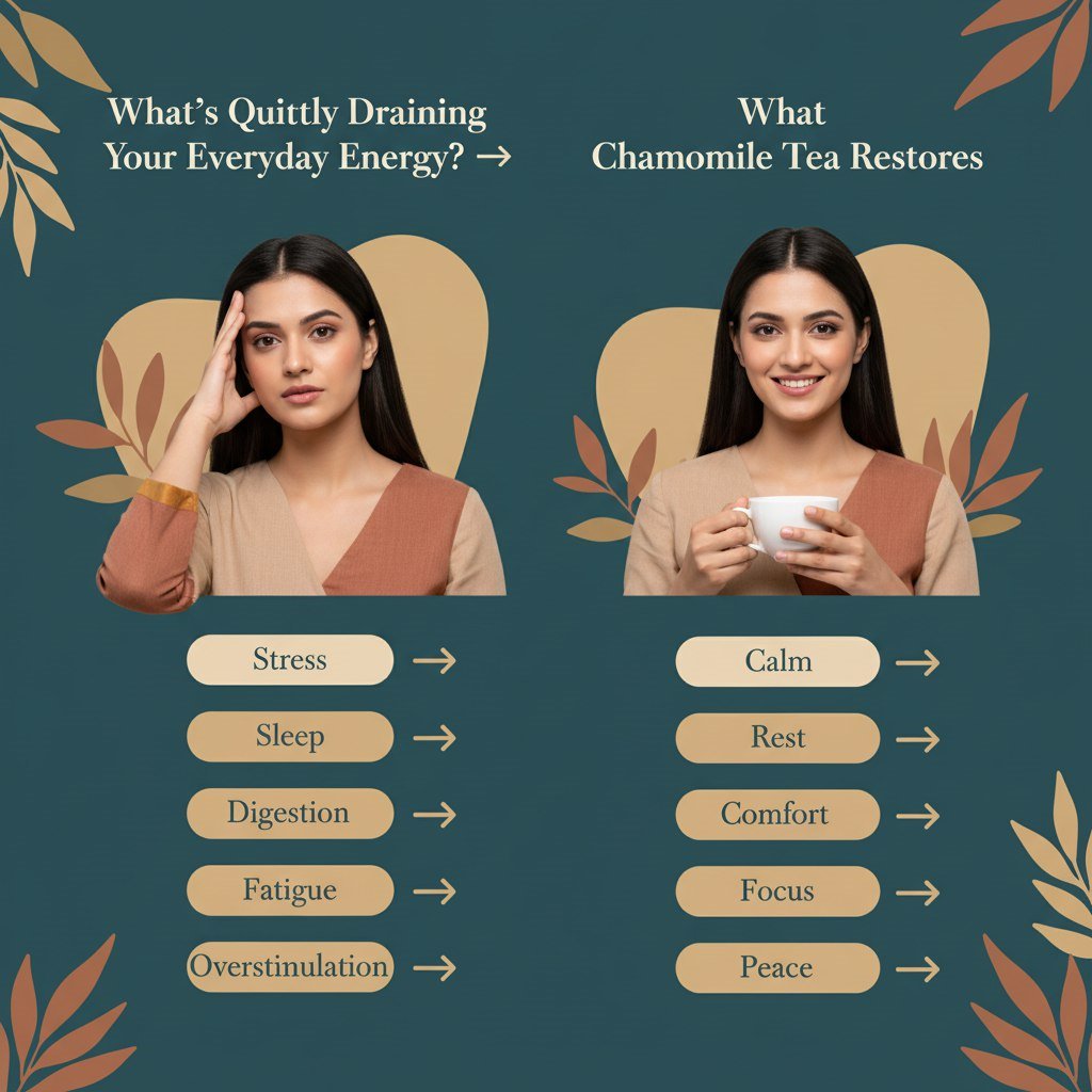 - Aids Sleep: Known for its natural sedative properties, Chamomile Tea can help improve sleep quality and combat insomnia.