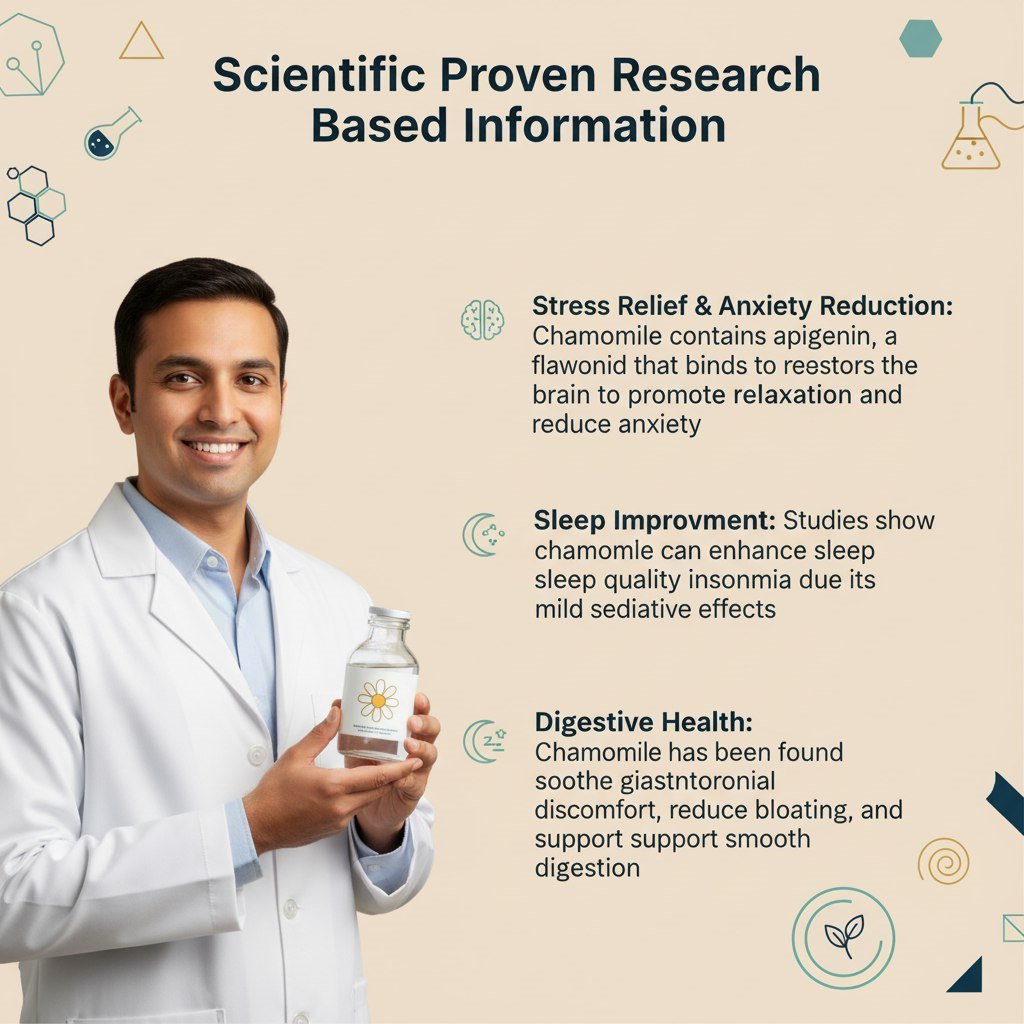 - Stress Relief & Anxiety Reduction: Chamomile contains apigenin, a flavonoid that binds to receptors in the brain to promote relaxation and reduce anxiety