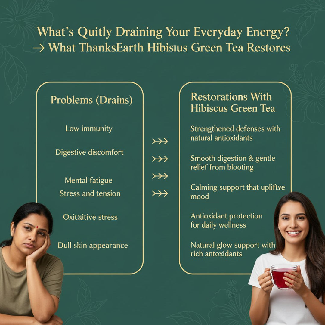 ThanksEarth Hibiscus Green Tea brings together the vibrant tang of hibiscus and the soothing clarity of green tea. This blend refreshes the body, supports metabolism, and gives a gentle detoxing effect. Rich natural acids from hibiscus help maintain healthy digestion, while green tea catechins boost energy and focus. Each cup feels light, floral, and rejuvenating — perfect for daily wellness and glowing vitality