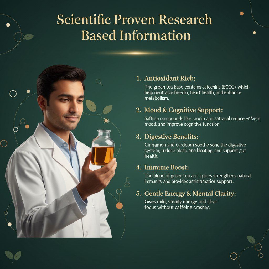 - Improves Skin Health: Saffron and green tea are known for their potential benefits to skin health, helping to improve complexion and reduce signs of aging.