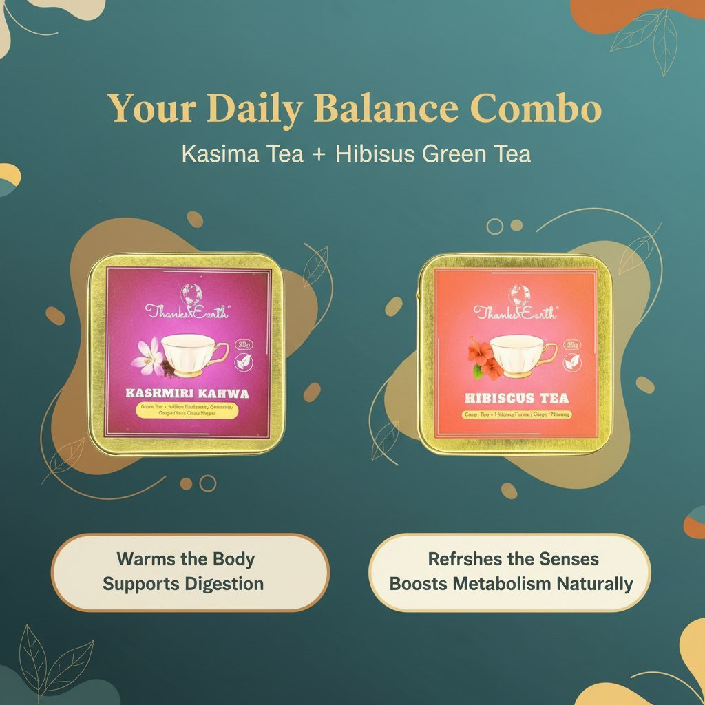 ThanksEarth Kashmiri Kahwa blends green tea leaves with aromatic spices like cinnamon, cardamom, and saffron, along with crushed nuts, creating a fragrant and soothing tea experience. Each cup supports digestion, boosts immunity, and provides a gentle energy lift with caffeine. Perfect for mornings, cold evenings, or post-meal relaxation, Kashmiri Kahwa is your daily companion for warmth, calm focus, and holistic wellness