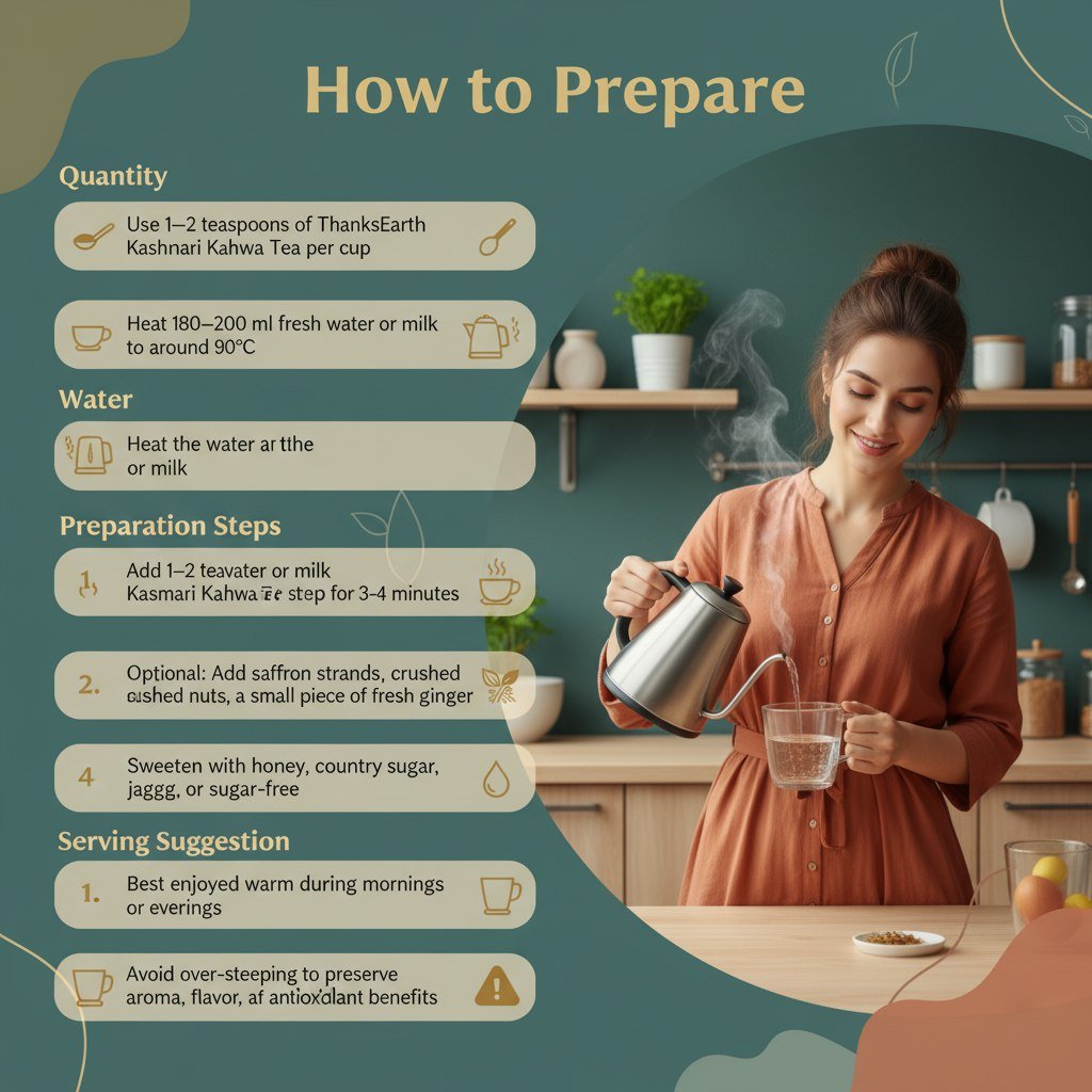 Quantity: Use 1–2 teaspoons of ThanksEarth Kashmiri Kahwa Tea per cup