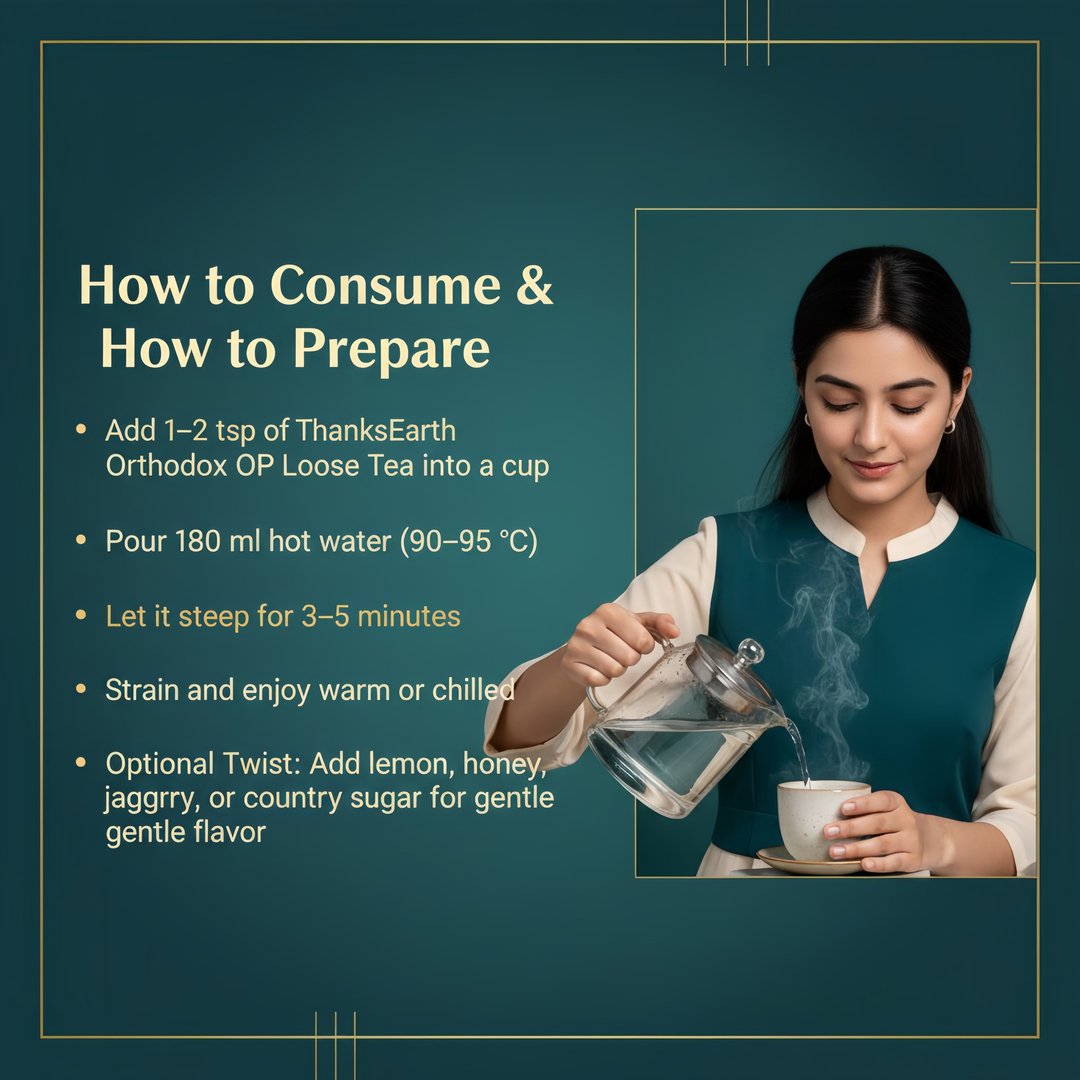 Adults (18–60 years): Best suited for daily tea drinkers who seek steady energy, focus, and relaxation. The natural caffeine and antioxidants in Orthodox OP Loose Tea help maintain alertness during busy mornings, improve digestion after meals, and support long-term heart health