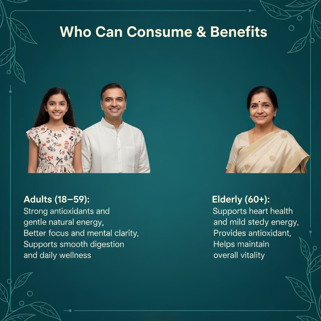 Elderly: A mild cup each day can promote smooth digestion, improve blood circulation, and offer gentle warmth that keeps the body active. Its antioxidant content also helps protect cells and supports overall wellness without causing restlessness