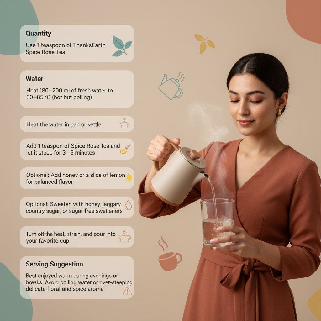 - Add 1 teaspoon of Spice Rose Tea and let it steep for 3–5 minutes