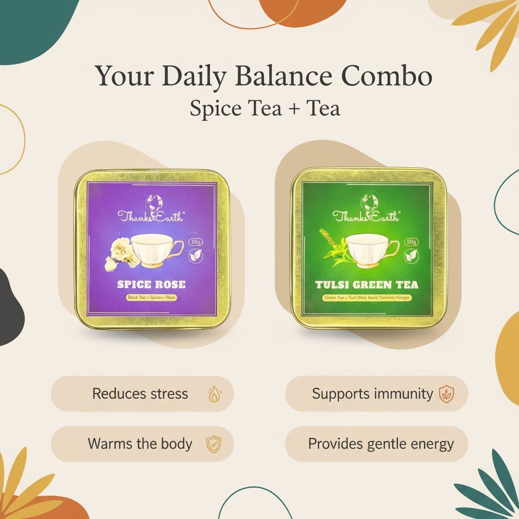 ThanksEarth Spice Rose Tea combines premium rose petals with aromatic spices like cinnamon, cardamom, and cloves. This caffeine tea offers a delightful floral-spice flavor, providing gentle energy, stress relief, and digestive comfort. Perfect for mindful tea moments, Spice Rose Tea is your companion for relaxation, warmth, and wellness throughout the day