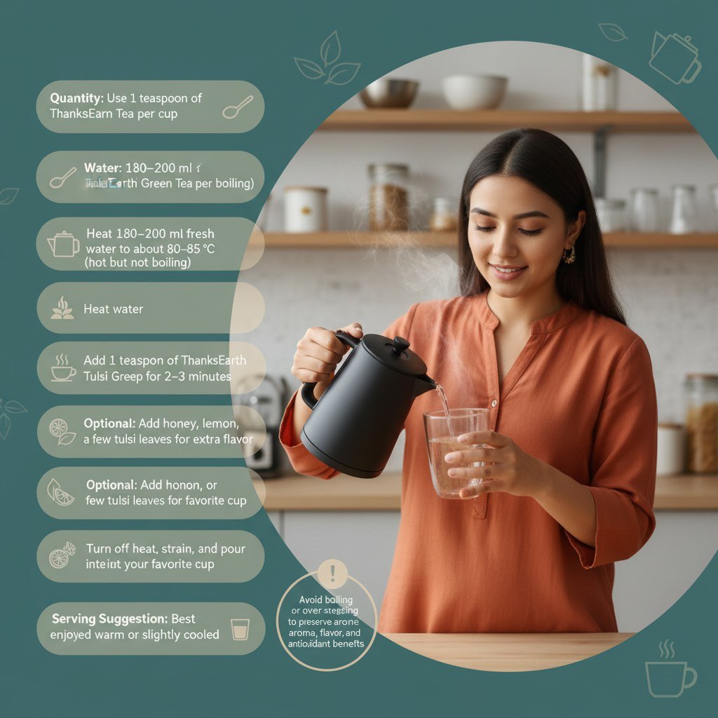 - Add 1 teaspoon of ThanksEarth Tulsi Green Tea and let it steep for 2–3 minutes